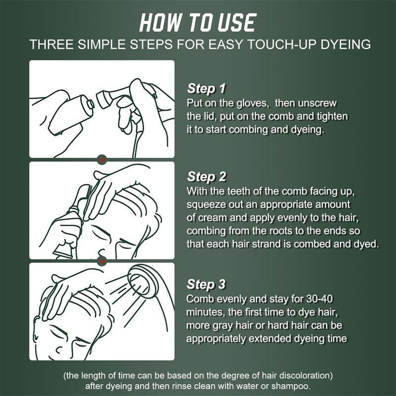 A: It’s as easy as 1-2-3! Wear the gloves, attach the dye comb to the bottle, and comb the dye through your hair from root to tip. Let it sit for 30-40 minutes, then rinse thoroughly. -